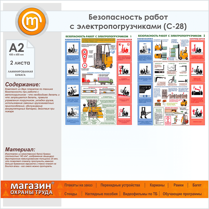 Плакаты «Безопасность работ с электропогрузчиками» (С-28, ламинированная бумага, А2, 2 листа) в Видном купить