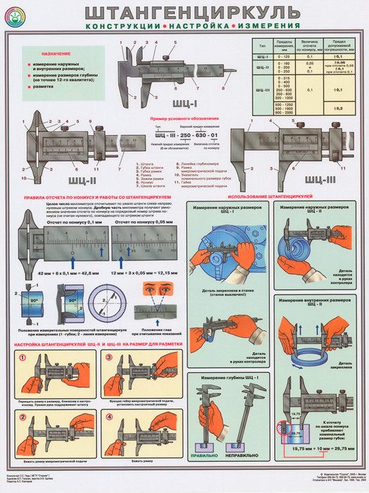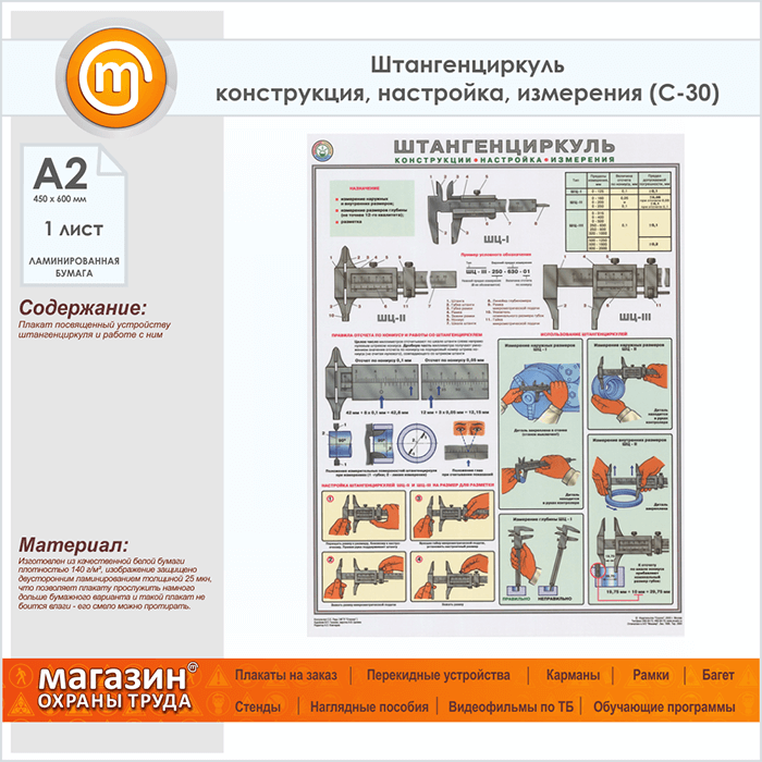 Плакат «Штангенциркуль - конструкция, настройка, измерения» (С-30, ламинированная бумага, А2, 1 лист) в Видном купить